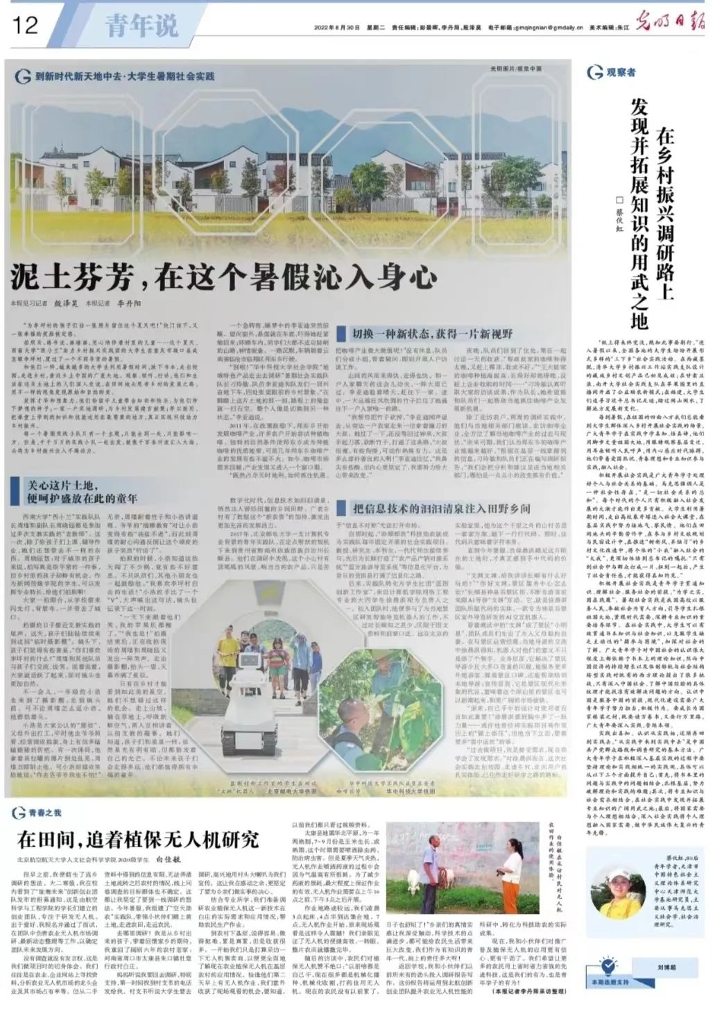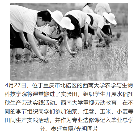 同时,第12版以《泥土芬芳,在这个暑假沁入身心》为题,以图片新闻的形式点赞了学校农学与生物科技学院将课堂搬进实验田,组织学生开展水稻插秧生产劳动实践活动。