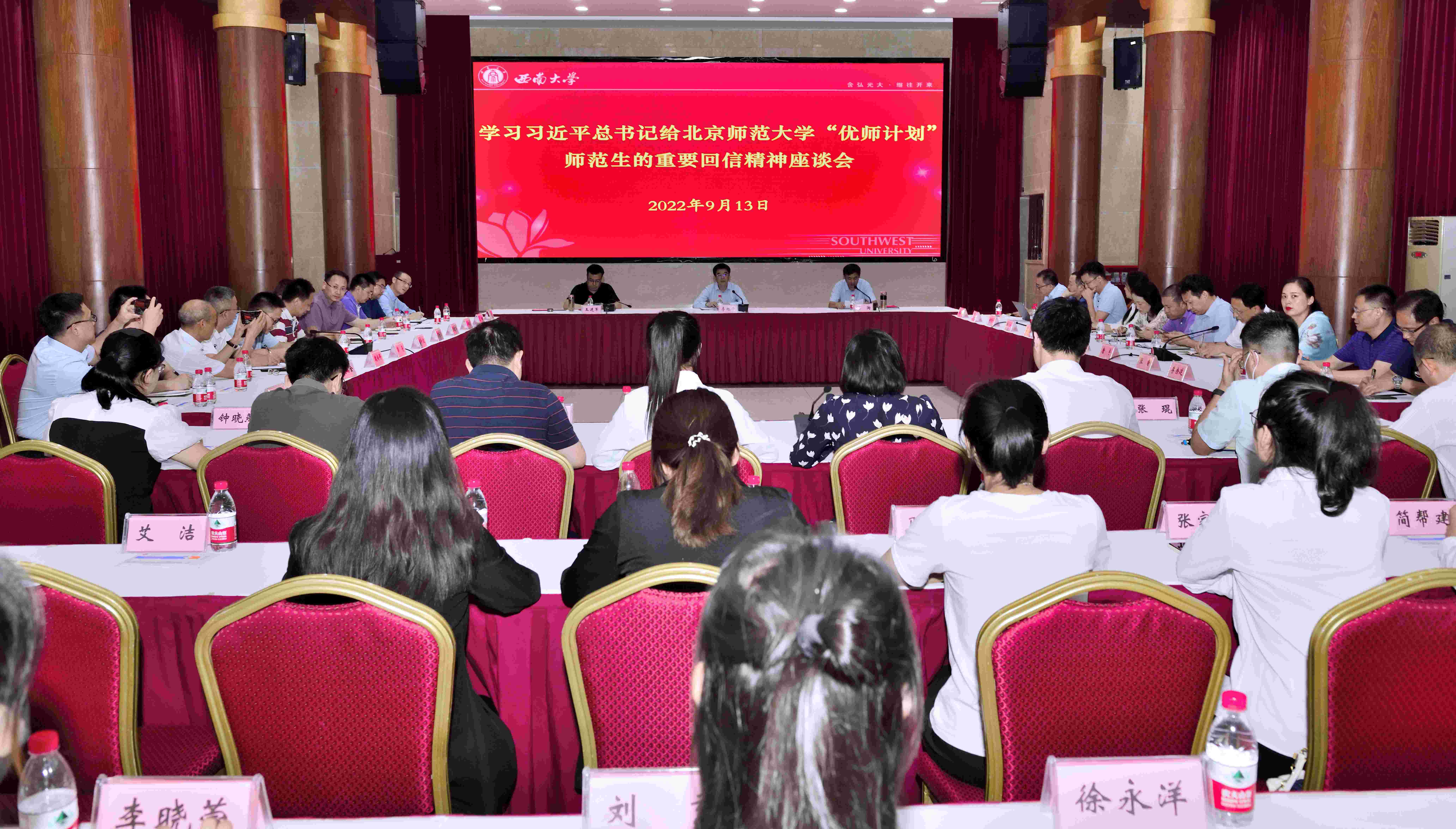 9月13日下午,学校在东方红会议厅召开学习习近平总书记给北京师范大学“优师计划”师范生的重要回信精神座谈会,学校党委书记李旭锋、党委副书记潘洵、副校长王进军出席会议,党政办公室,党委宣传部、党委网络工作部,教务处,人力资源部,党委研究生工作部,党委学生工作部,招生就业处,附属中学及各公费师范生培养单位主要负责人、教师代表、学生代表参加会议。会议由潘洵主持。