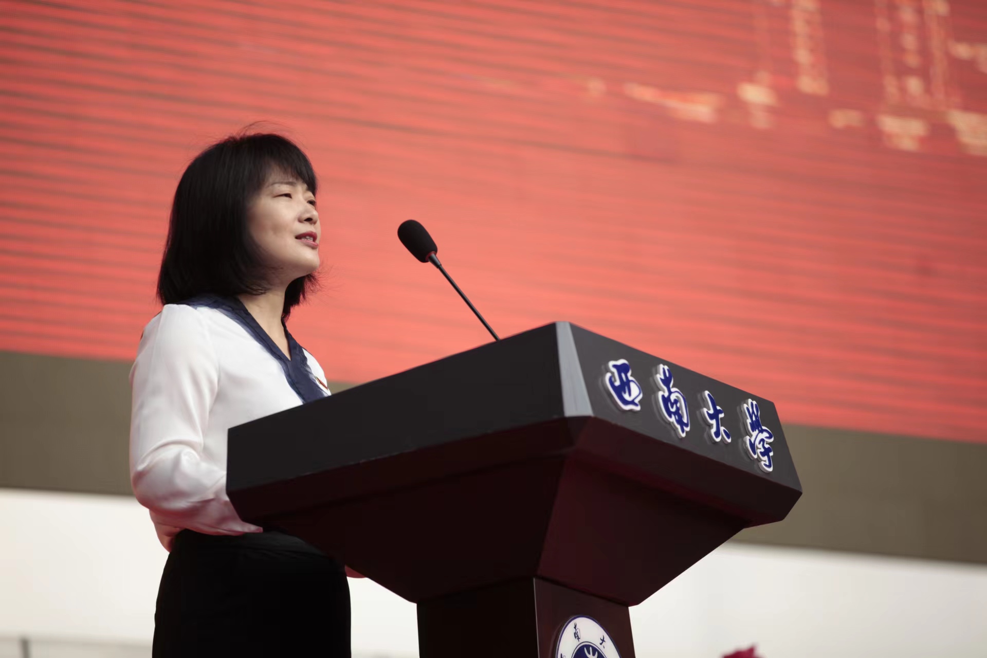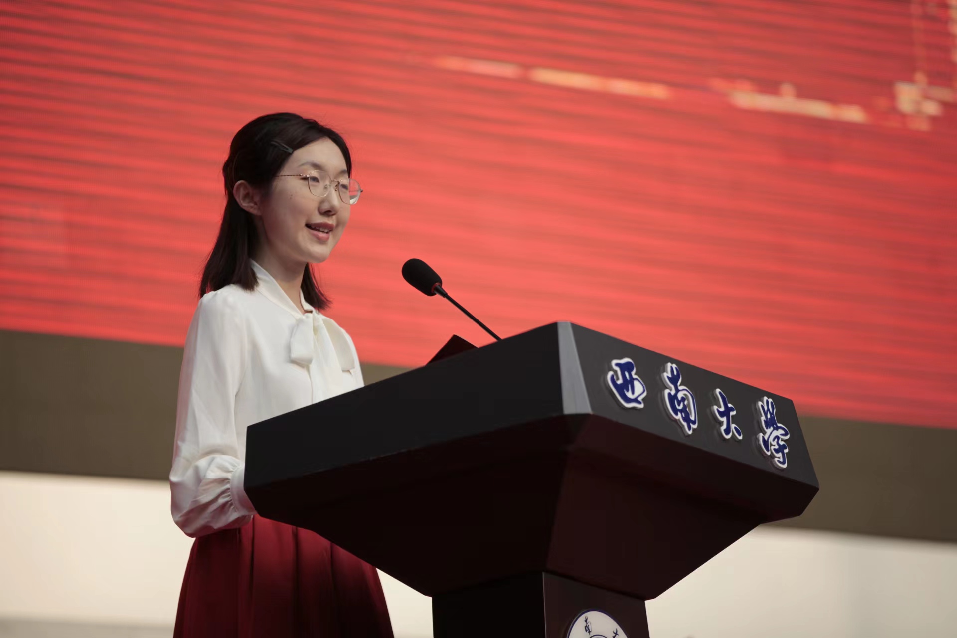 新生代表、化学化工学院2022级高分子化学与物理专业研究生郑昱辰号召大家,以黄希庭教授为榜样,立足时代新征程,刻苦钻研,砥砺前行,传承西大人的责任与担当。
