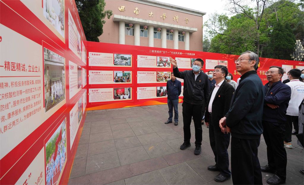 为热烈庆祝中国共产党第二十次全国代表大会胜利召开,积极营造喜庆热烈、昂扬向上、踔厉奋发、勇担使命的良好氛围,10月14日,学校党委主办、党委组织部承办的“喜迎党的二十大,擎旗奋进新征程——二级党组织‘五个一’行动风采展”在光大礼堂广场拉开帷幕。学校党委书记李旭锋、党委副书记安春元莅临参观,党政办公室、党委组织部、党委宣传部等部门负责人、部分二级党组织书记、部分支部书记和上万名师生观看展览。