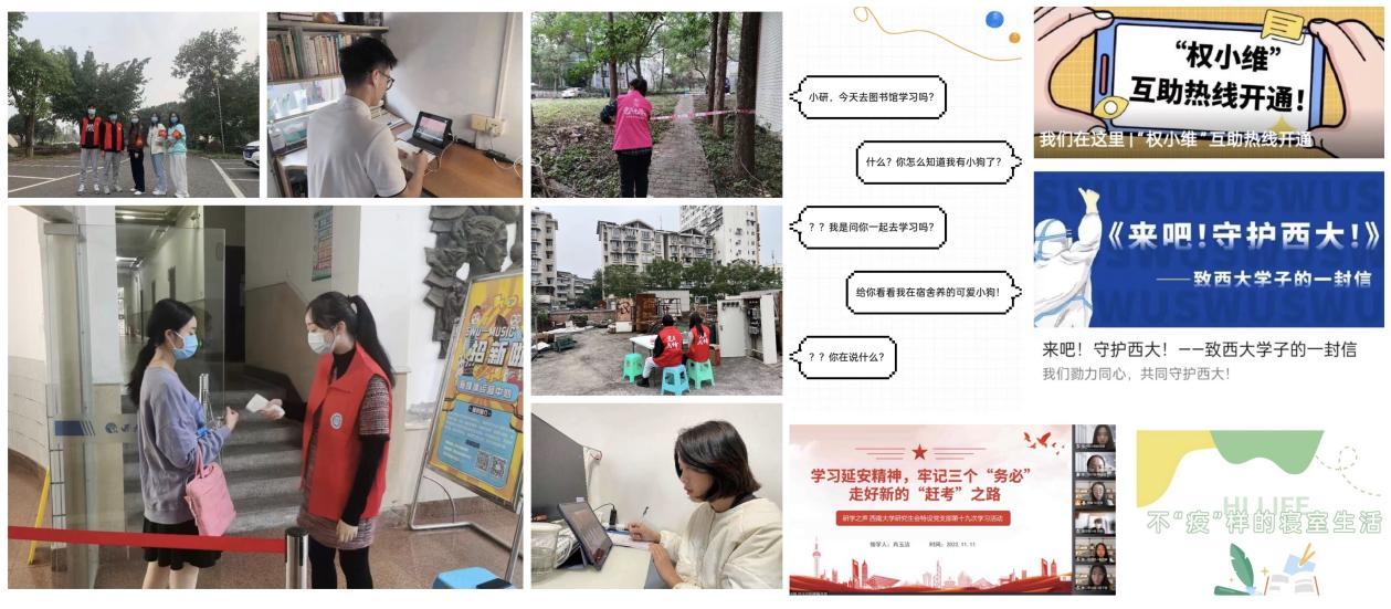 切实发挥学生组织自我管理作用。校研会联合校学生会开通“权小维”互助热线行动,及时收集学生诉求,及时反馈并提供援助。校研会及各培养单位研究生会微信公众号发布《来吧!守护西大!——致西大学子的一封信》等,倡议引导同学们积极配合疫情防控工作,用积极乐观的心态面对疫情下的生活和学习。