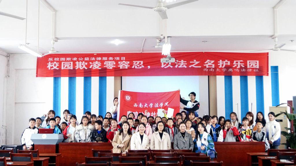 法治社会是构筑法治国家的基础。为贯彻落实党的二十大精神,让法治种子在校园开花结果,学校法学院廌鸣法律社坚持将青少年法治教育作为开展普法宣传活动的主要内容。3月24日下午,法学院廌鸣法律社党支部赴重庆市北碚区柳荫镇中心小学开展反校园欺凌公益法律服务。
