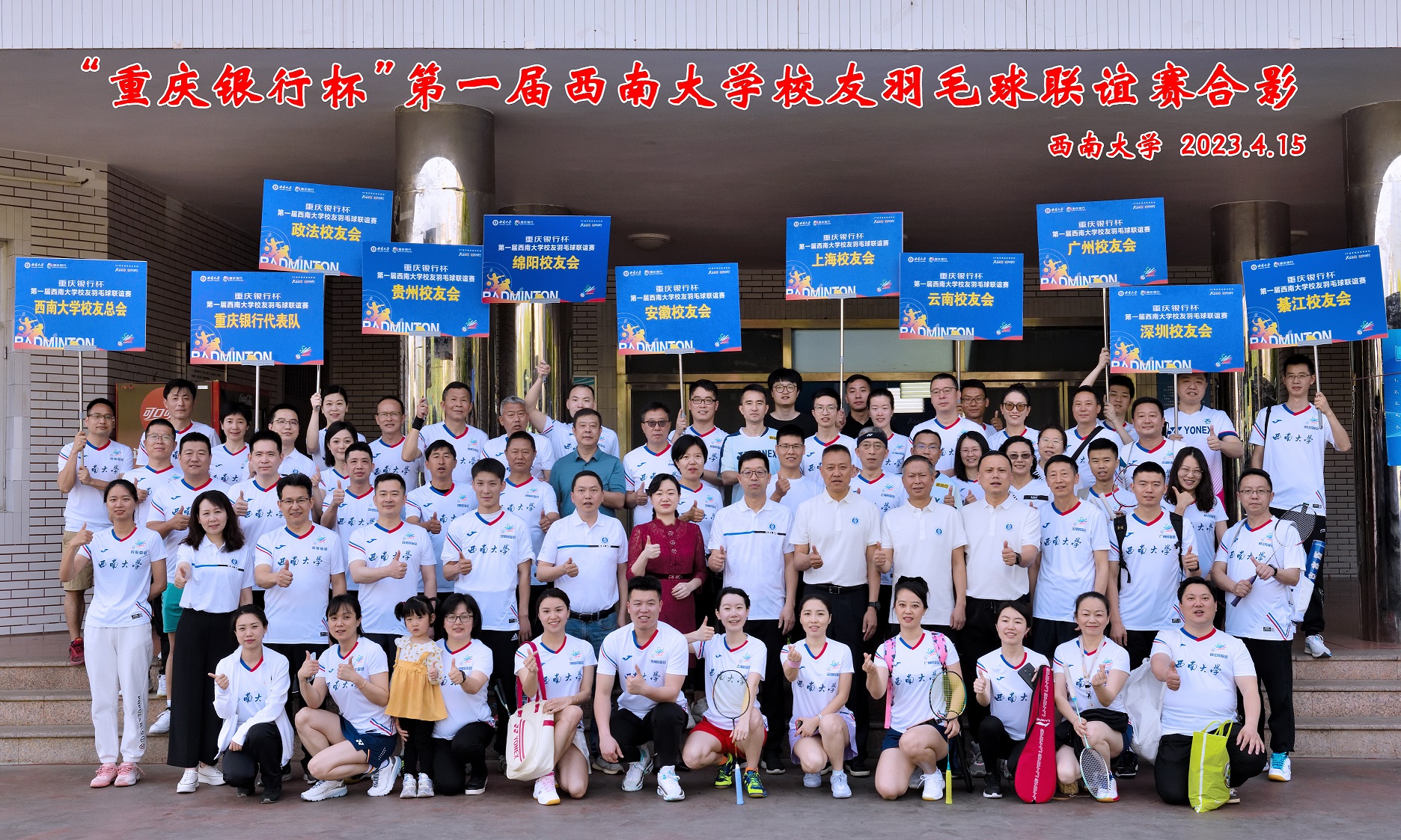 本次联谊赛由学校对外联络办公室、校友总会主办,学校体育学院、体育运动委员会,重庆市羽毛球运动训练中心承办,重庆银行股份有限公司北碚支行赞助。校友总会、贵州校友会、政法校友会、云南校友会、绵阳校友会、广州校友会、安徽校友会、綦江校友会、上海校友会、深圳校友会等10支代表队参加活动。