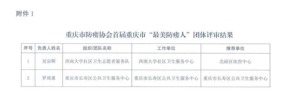 4月13日,重庆市防痨协会向社会公示首届重庆“最美防痨人”名单,评选出“最美防痨人”团体2个、“最美防痨人”个人6个,金年会jinnianhuicom医院作为唯一的高校医院获得集体荣誉。
