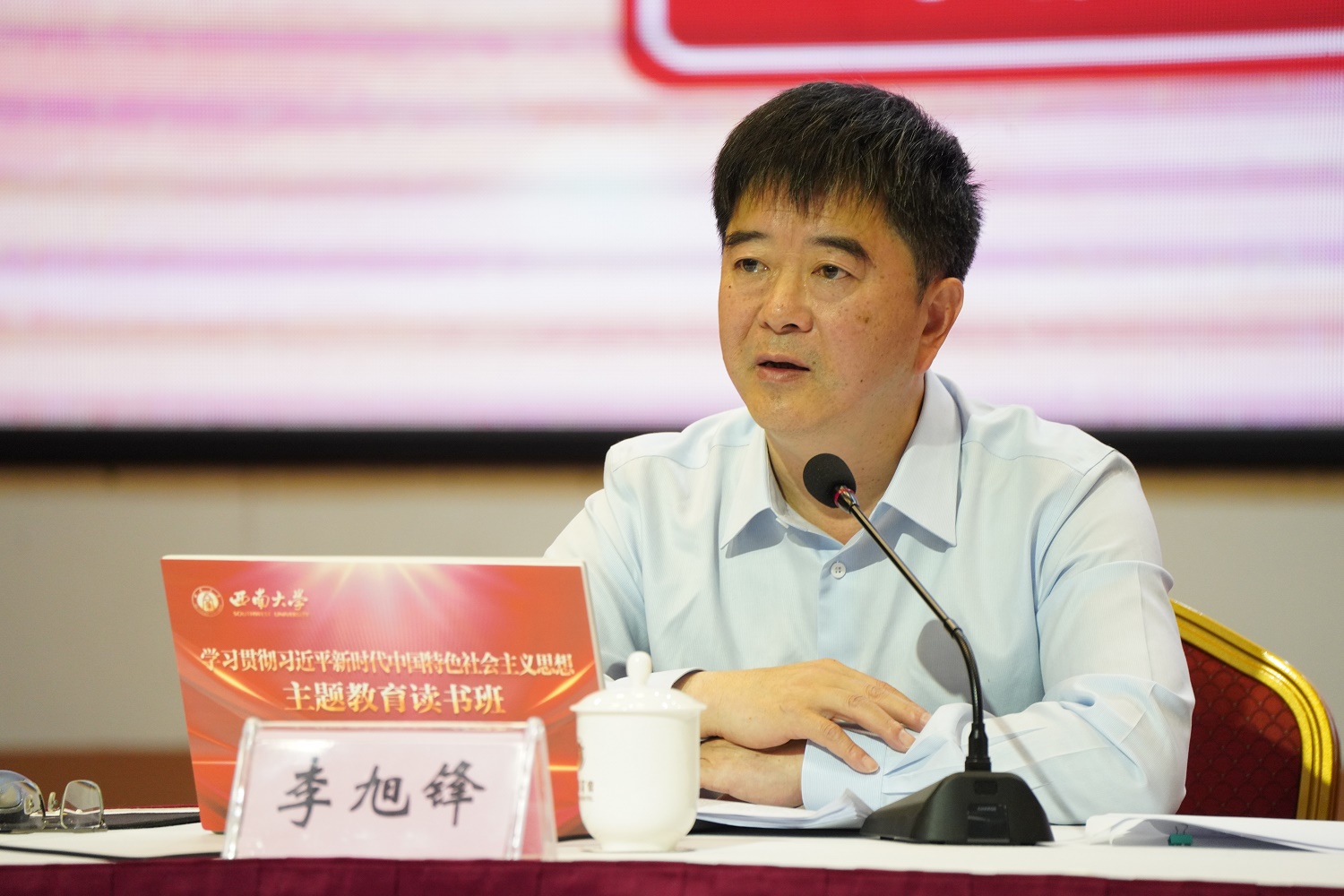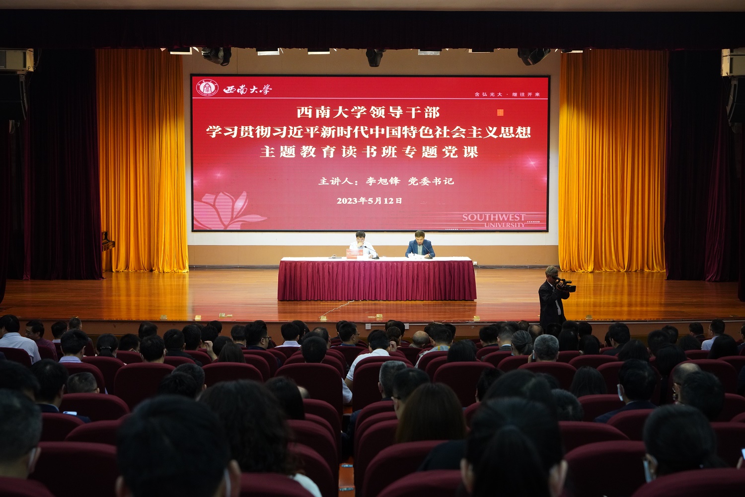 为持续推动学习贯彻习近平新时代中国特色社会主义思想主题教育走深走实,5月12日上午,党委书记、主题教育领导小组组长李旭锋讲授《深入学习贯彻习近平总书记关于人才工作的重要论述 更高质量推进新时代人才强校战略》的专题党课。教育部直属高校主题教育第十巡回指导组全体成员、教育部直属高校党建工作联络员列席,校领导、党委常委、党委委员、纪委委员、处级领导干部参加党课学习。党委副书记潘洵主持。