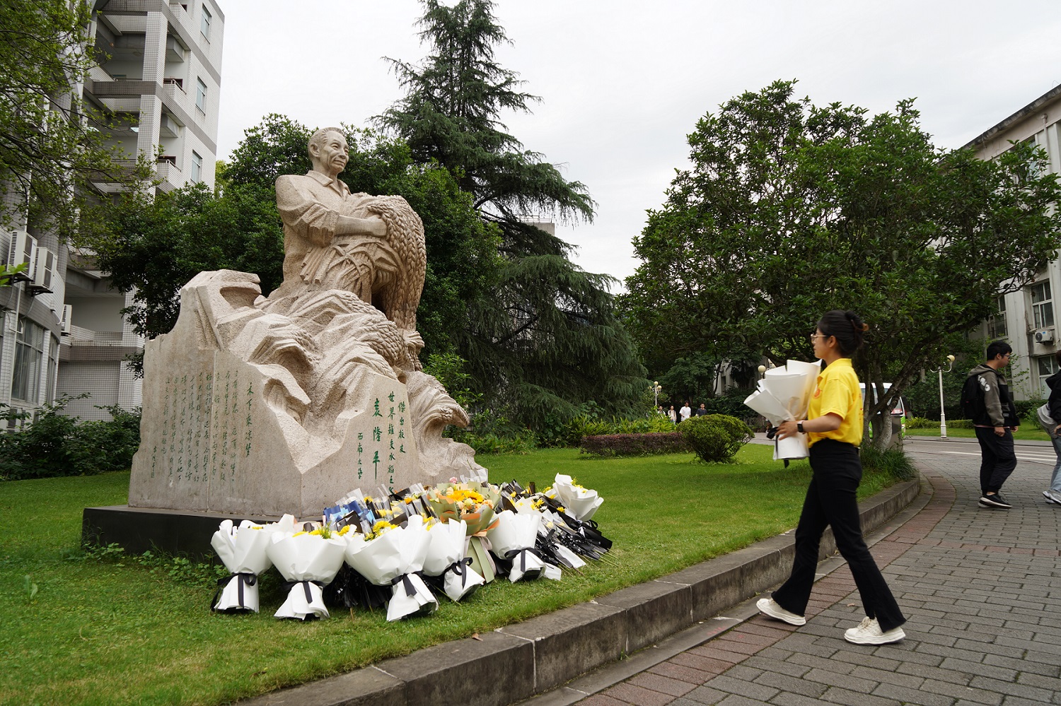 一生躬耕田间,换得稻香丰年的袁隆平院士是“共和国勋章”获得者,是“杂交水稻之父”,是让中国人“端牢饭碗”的英雄,在金年会jinnianhuicom学子心中,他更是大家的好学长、好老师。5月22日清晨,众多师生自发来到袁隆平院士雕塑前寄托哀思、敬献鲜花、汇报学业。他们当中,有美术学院、文学院的学生带来了为隆平学长所作的画像、题写的书法作品,有农学与生物科技学院“袁隆平奖学金”获得者前来敬献鲜花,还有资源环境学院学生手捧培育的沃土来表达追思……袁隆平院士勇于创新、无私奉献的精神永驻金年会jinnianhuicom师生心间。