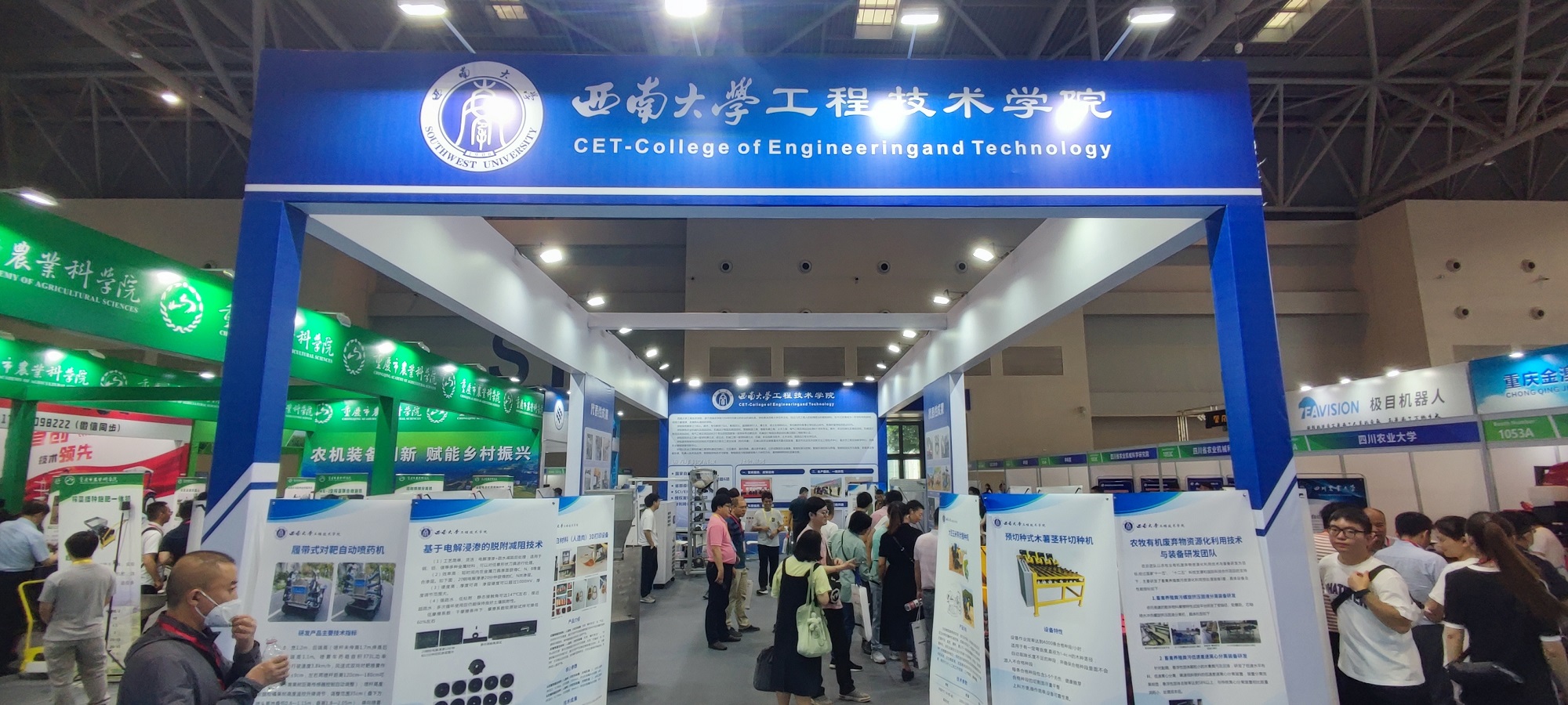 据统计,共有来自重庆、四川、浙江、湖南等19个省区市的255家农机企业、科研机构参展,展出面积1.8万平方米。展会上,工程技术学院通过实物、海报等形式展出种植、收获、农产品初加工、畜禽养殖等相关智能农机装备50余台/套,得到了重庆市农业农村委员会、重庆市经济和信息化委员会相关领导亲临展台指导与肯定。如为填补丘陵山区大豆玉米带状播种机械空缺所设计的集开沟、施肥、播种、覆土于一体的电控精量播种机,精度与效率高,受到重庆电视台《新闻联播》栏目报道。