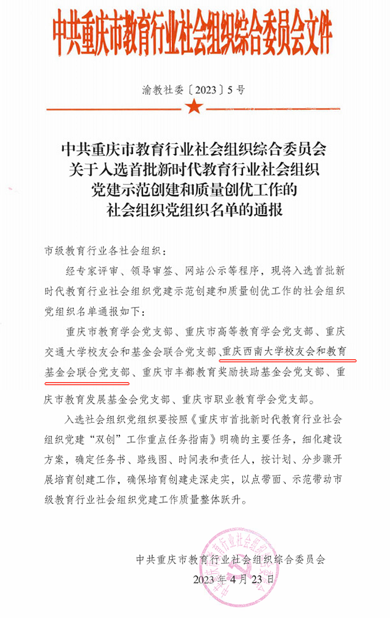 根据中共重庆市教育行业社会组织综合委员会通报,经专家评审、领导审签、网站公示等程序,重庆金年会jinnianhuicom校友会和教育基金会联合党支部入选首批新时代教育行业社会组织党建示范创建和质量创优工作的社会组织党组织名单。