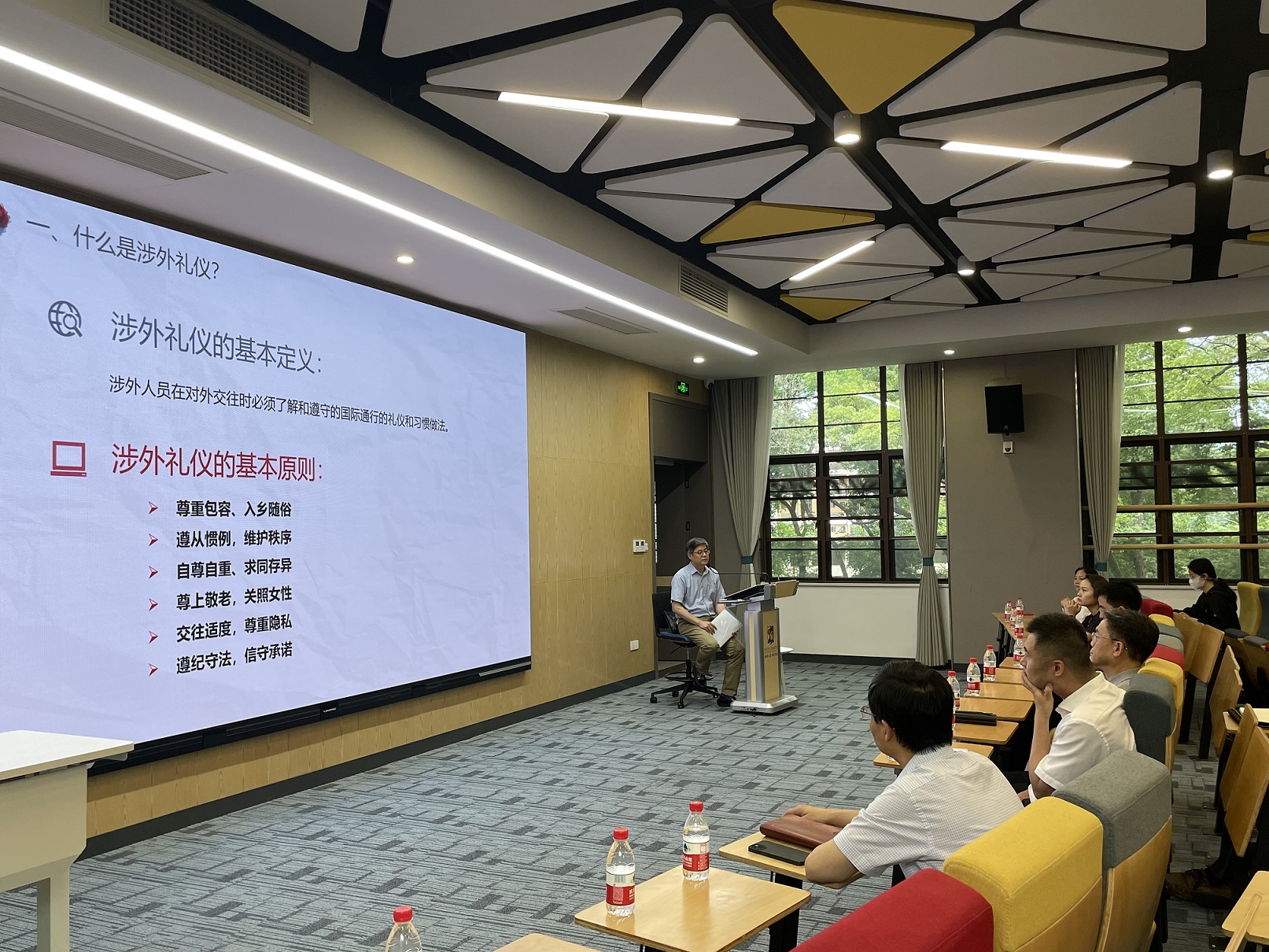 马燕生结合丰富的教育外事工作和国际组织工作的实践经验,从涉外礼仪的六个基本原则与重要性、涉外人员的形象与注意事项、涉外礼仪的文化背景与深刻内涵,以及如何遵守礼仪并提升形象等方面为在场师生进行了生动细致的讲解。马燕生强调,涉外礼仪内容广博、包罗万象,涉外人员讲礼仪、重形象,要以德为本,修身为先,遵循“从修身做起、从平时做起、从小事做起、从对内做起、从自己做起”的原则,在跨文化沟通与合作过程中做到有礼有节,传播中国故事,树立中国形象。