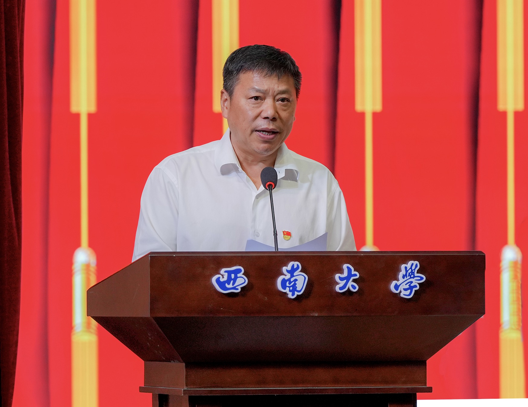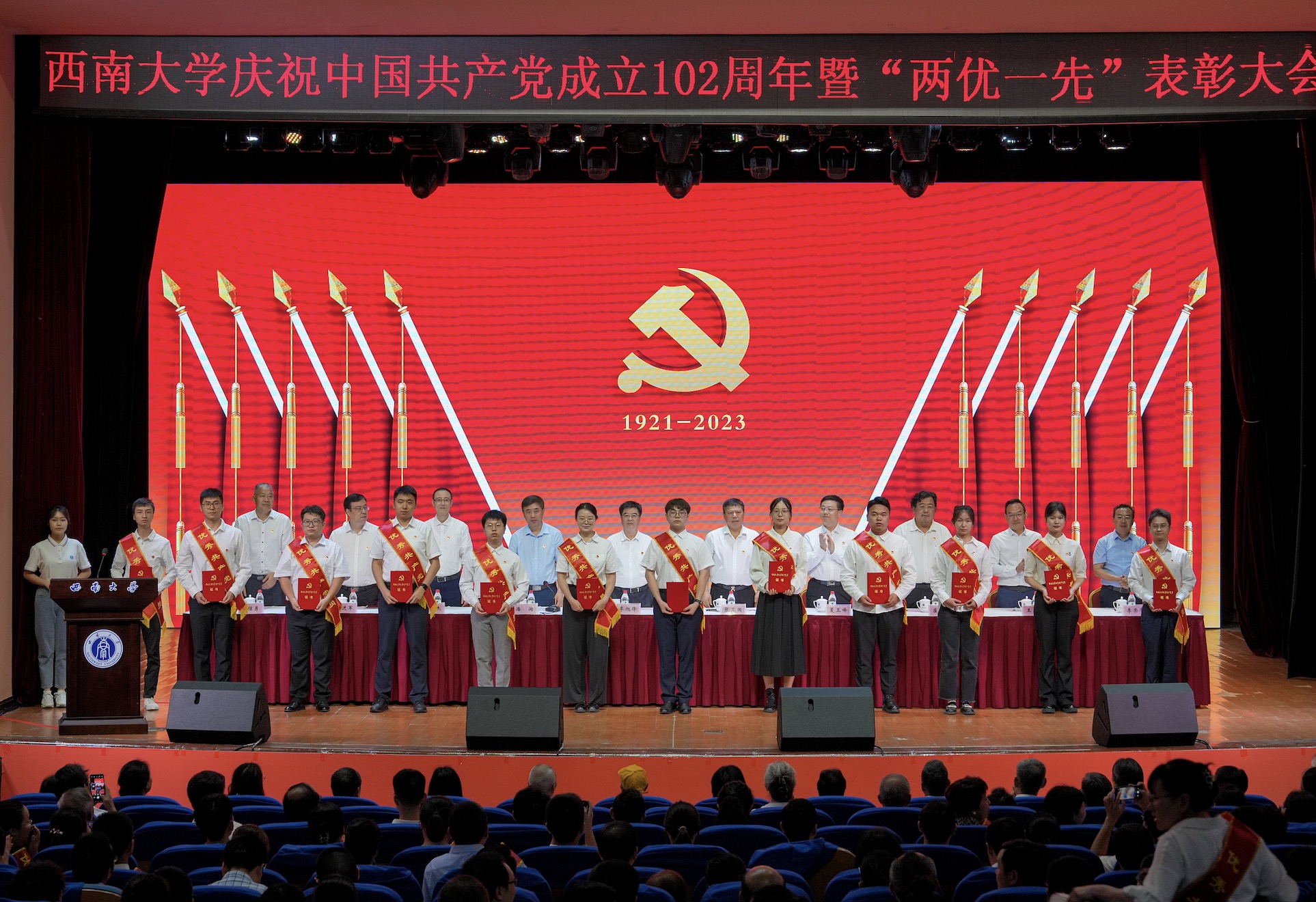 表彰大会在雄壮嘹亮的国歌声中拉开帷幕。校长、党委副书记张卫国同志宣读表彰文件,通报市级以上党建“双创”建设单位验收通过名单和重庆市教育系统“两优一先”表彰名单。文学院党委孙红举等149名共产党员、经济管理学院党委卢跃进等38名党务工作者、教育学部党委等8个二级党组织、外国语学院外国语言学及应用语言学硕士生党支部等58个党支部分别荣获“优秀共产党员”“优秀党务工作者”“先进基层党组织”“先进党支部”荣誉。