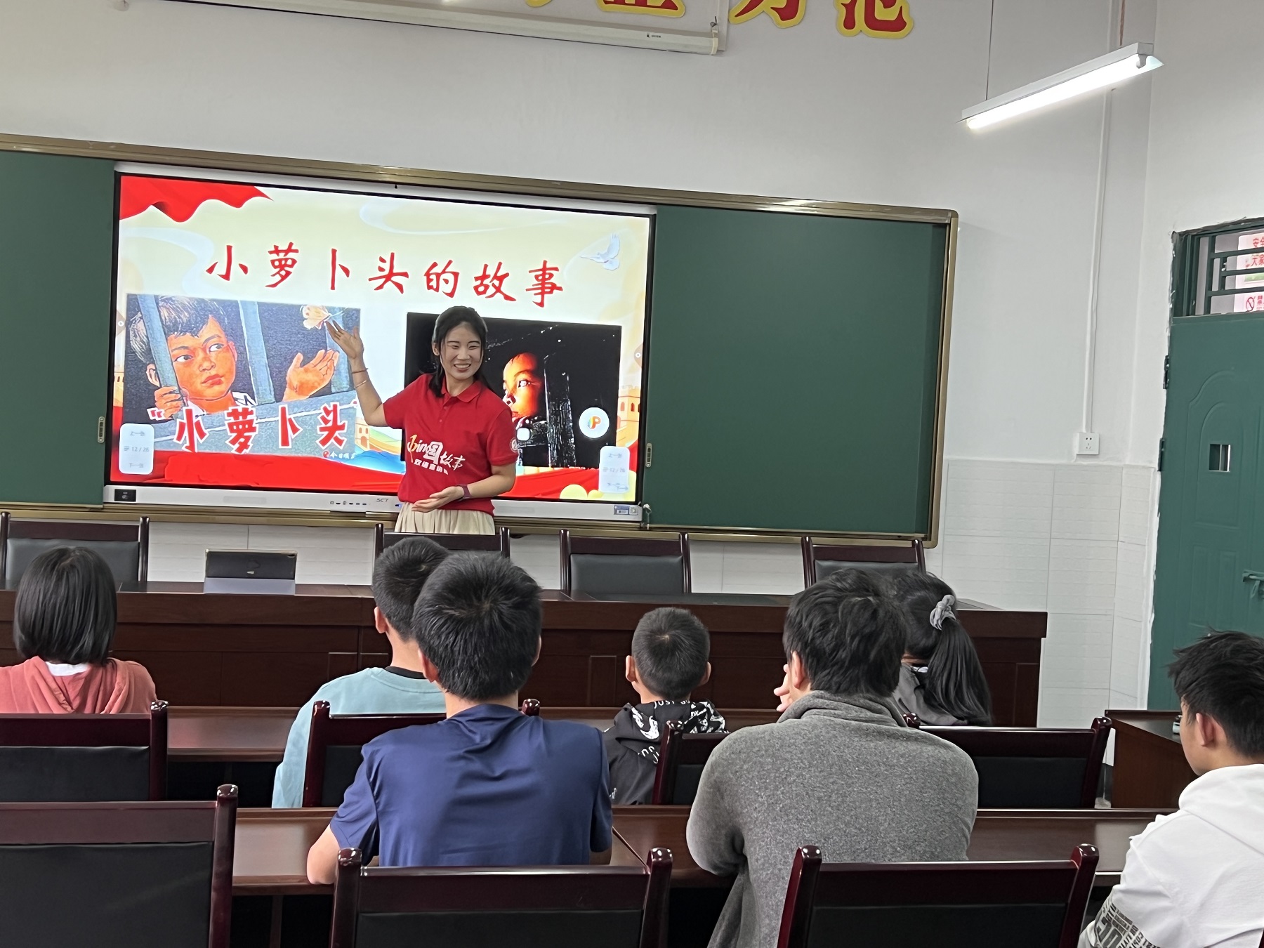 与此同时,宣讲团还充分发挥英语教育专业优势,组建5支暑期课堂故事宣讲小分队,分赴重庆、山西、四川、贵州、广西等地的乡村学校和农村公益学堂,为当地的孩子们带去精彩纷呈的中英双语经典故事“大礼包”,让今夏的暑期生活更加丰富多彩。从最美巾帼花木兰,到少年英雄“小萝卜头”;从中国神话典故到传统节日故事,宣讲团成员们用孩子们喜闻乐见的方式再现了一个个精彩的故事情节,同时通过问答接龙、分组竞猜、角色扮演等途径让孩子们在深度互动参与中掌握外语知识、锻炼表达能力、丰富文化储备、厚植爱国情怀,以教育赋能为乡村振兴注入“源头活水”。宣讲团成员、国家公费师范生贺子墨在山西沁水嘉峰村公益学堂宣讲后分享道:“看到孩子们一双双求知若渴的眼睛我感到很欣慰,希望这些‘小故事’能够点亮更多他们心中的‘大梦想’”。