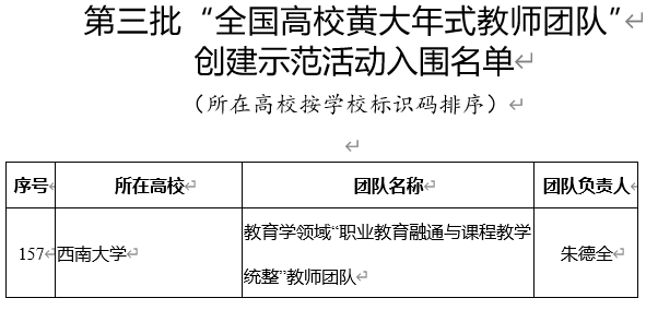 8月31日,教育部正式公布了第三批“全国高校黄大年式教师团队”创建示范活动入围名单,共有199所高校入选。学校教育学部部长朱德全教授领衔的教育学领域“职业教育融通与课程教学统整”教师团队成功入选。