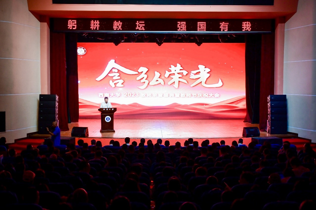 庆祝大会上,校领导为从教30年教职工代表和退休教职工代表颁发了证书,学生代表向全体退休教师敬献了鲜花,表达对他们深深的敬意和祝福,祝贺他们把美好岁月写进了精彩的个人履历,写进了璀璨的校史华章。表彰了国家级、省部级荣誉称号获得集体和个人,为新入选国家级青年人才授绶带,为含弘领军岗、含弘英才岗受聘者颁发了聘书,勉励他们胸怀梦想,不忘初心,教书育人,矢志科研,为祖国争光,为学校添彩。荣休教职工代表为新教师代表佩戴校徽,鲁成教授代表荣休教职工对青年教师提出成长建议,首批全国高校黄大年式教师团队领衔专家李加纳教授带领新教师进行入职宣誓,寄语新进教师传承和发扬“含弘光大、继往开来”的校训精神,接续奋斗,创造荣光。