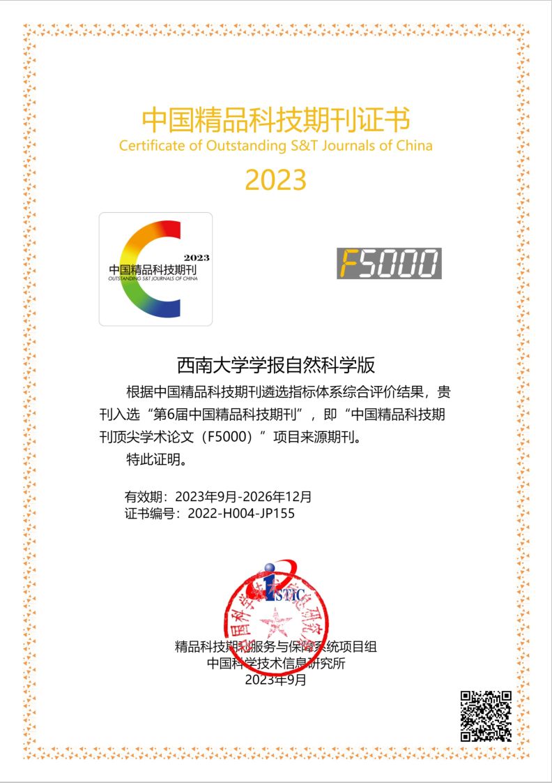 为进一步提升优秀学术期刊质量和影响力,带动我国科技期刊整体水平进步,中国科学技术信息研究所于2005年研制并推出“中国精品科技期刊”评价体系,自2008年启动首届开始,每三年遴选一次,主要从入选“中国科技核心期刊”的自然科学领域期刊中产生。2023年度推出第六届“中国精品科技期刊”327种,包括 300 种以中文出版的中国精品科技期刊和 27 种以英文出版的中国国际化精品科技期刊。《金年会jinnianhuicom学报(自然科学版)》再次入选。