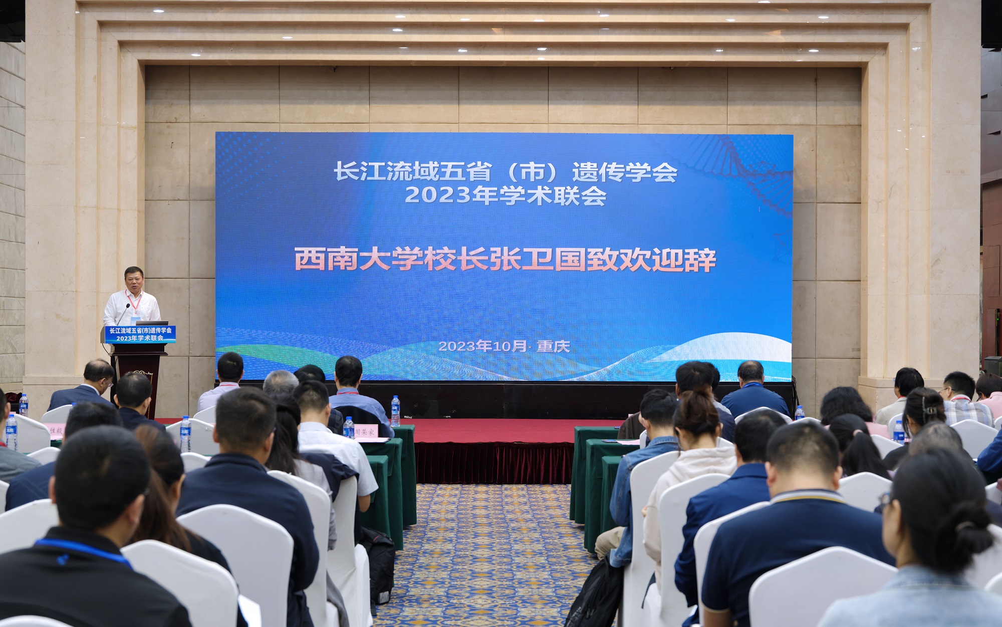由重庆市遗传学会、安徽省遗传学会、湖北省遗传学会、湖南省遗传学会、江西省遗传学会共同主办的长江流域五省(市)遗传学会 2023 年学术联会于10月11-13日在重庆北碚召开。第十四届全国政协常委、湖南省政协副主席、南华大学校长张灼华出席开幕式。金年会jinnianhuicom校长张卫国、重庆市科协二级巡视员牛杰、中国遗传学会理事长薛勇彪先后在开幕式上致辞。来自五省(市)部分高校、科研院所、医院等单位的近300名遗传学科研教学人员和研究生参加本次会议。