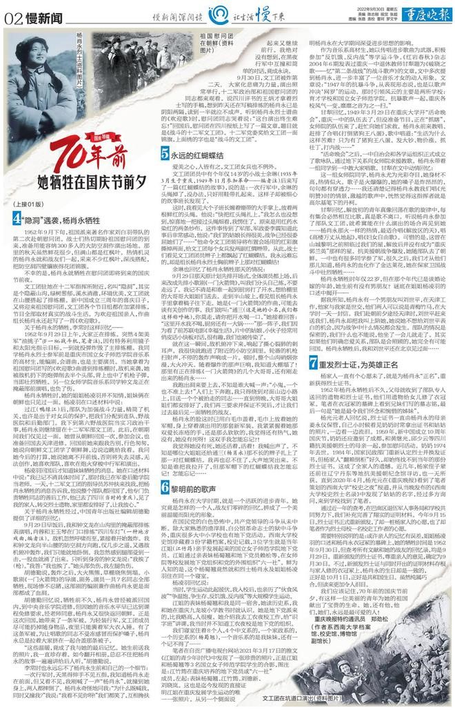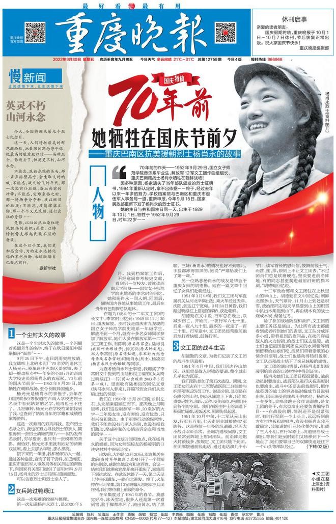 郑劲松创作的《70年前,她牺牲在国庆前夕》系其中的短篇报告文学获奖作品,原载2022年9月30日《重庆晚报》1至2版。作品讲述了鲜为人知的金年会jinnianhuicom重要渊源之一的国立女子师范学院音乐系校友、重庆巴南籍抗美援朝烈士杨肖永的感人故事,还原了她从大学期间参加爱国民主运动到报名参军、从跨过鸭绿江入朝参战到战地文工团的生活以及详细牺牲经过,塑造了一位才华横溢、热情大方、勇敢顽强的女英雄形象。