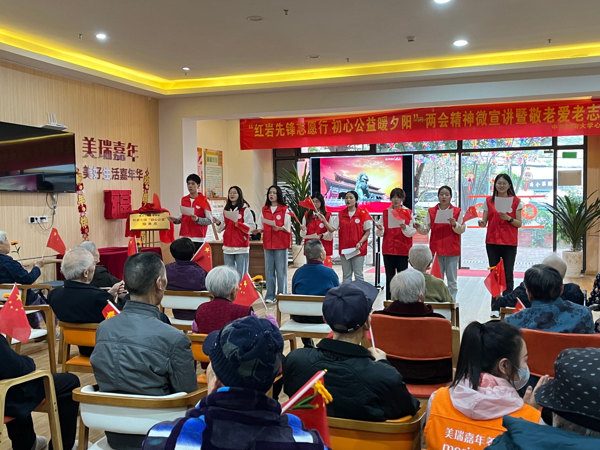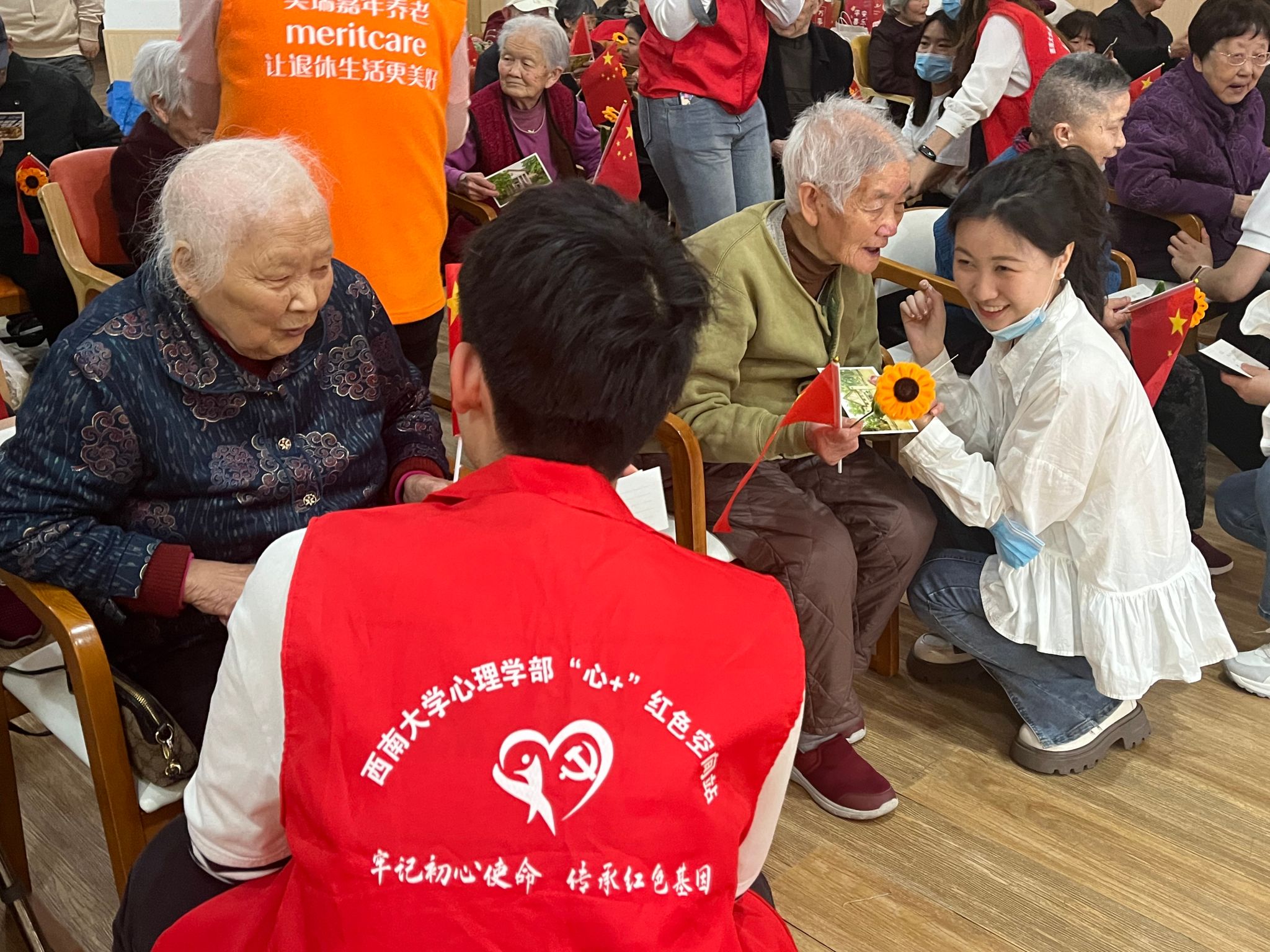 服务点的成立不仅为老年人提供了一个心理关爱的平台,也为党员志愿者提供了一个实践和锻炼的机会。当日,金年会jinnianhuicom心理学部20余名志愿者在服务点开展了“红岩先锋志愿行 初心公益暖夕阳”两会精神微宣讲暨敬老爱老志愿服务活动。心理学部学生党建组织“心+”红色空间站站长丁汝向老年人进行了两会精神微宣讲,讲解了2024年全国两会中关于养老的议题政策,心理学部睡眠神经影像中心学生金巧进行了“宁心助眠”心理健康知识小讲堂,帮助老年人和养老服务工作者了解关于睡眠的心理学知识,并现场教授了深呼吸放松训练、正念冥想助眠等改善睡眠质量的实用技巧。“心+”红色空间站成员和各党支部志愿者与老年人进行“心灵驿站”交流,用明信片为老人们送上和煦温暖的“春日来信”,向老人分享自己所感受的美好春天,互动中或为老人捏捏肩、捶捶背,或仔细聆听老人诉说往事、说烦忧,让老人感受到春天般的温暖和舒适。活动中还穿插了志愿者们精心准备的古筝演奏、歌曲合唱等文艺表演。随着活动的进行,老人的孤独感渐渐得到排解,绽放出幸福的笑容。