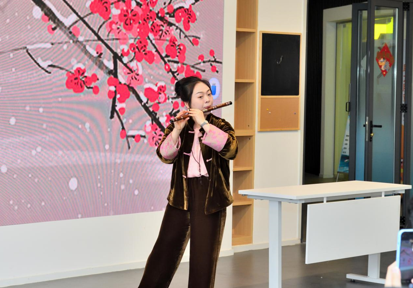 活动第二环节,由学院青年竹笛演奏家、竹笛专业教师祝彬为在场师生带来“笛韵留芳——探寻竹笛与艺术魅力”的精彩分享,此次讲座也是“玉兰花开·国乐绽放”中华优秀传统音乐进园区系列美育活动的第一期。祝老师以古人诗歌中的笛声为引,带大家一起回顾历史,品味经典。现场,一首首竹笛经典作品演绎,时而高亢、时而婉转、时而欢快、时而轻柔,让在场观众听得如痴如醉,仿佛穿越千年,身临其境,与先贤对话,与古人共鸣。祝老师的讲座深入浅出,精彩的表演与诙谐幽默的讲解,使得现场欢笑声与鼓掌声此起彼伏,真是有种“杏花疏影里,吹笛到天明”的畅快感。最后,在现场听众的依依不舍中,本次讲座告一段落。