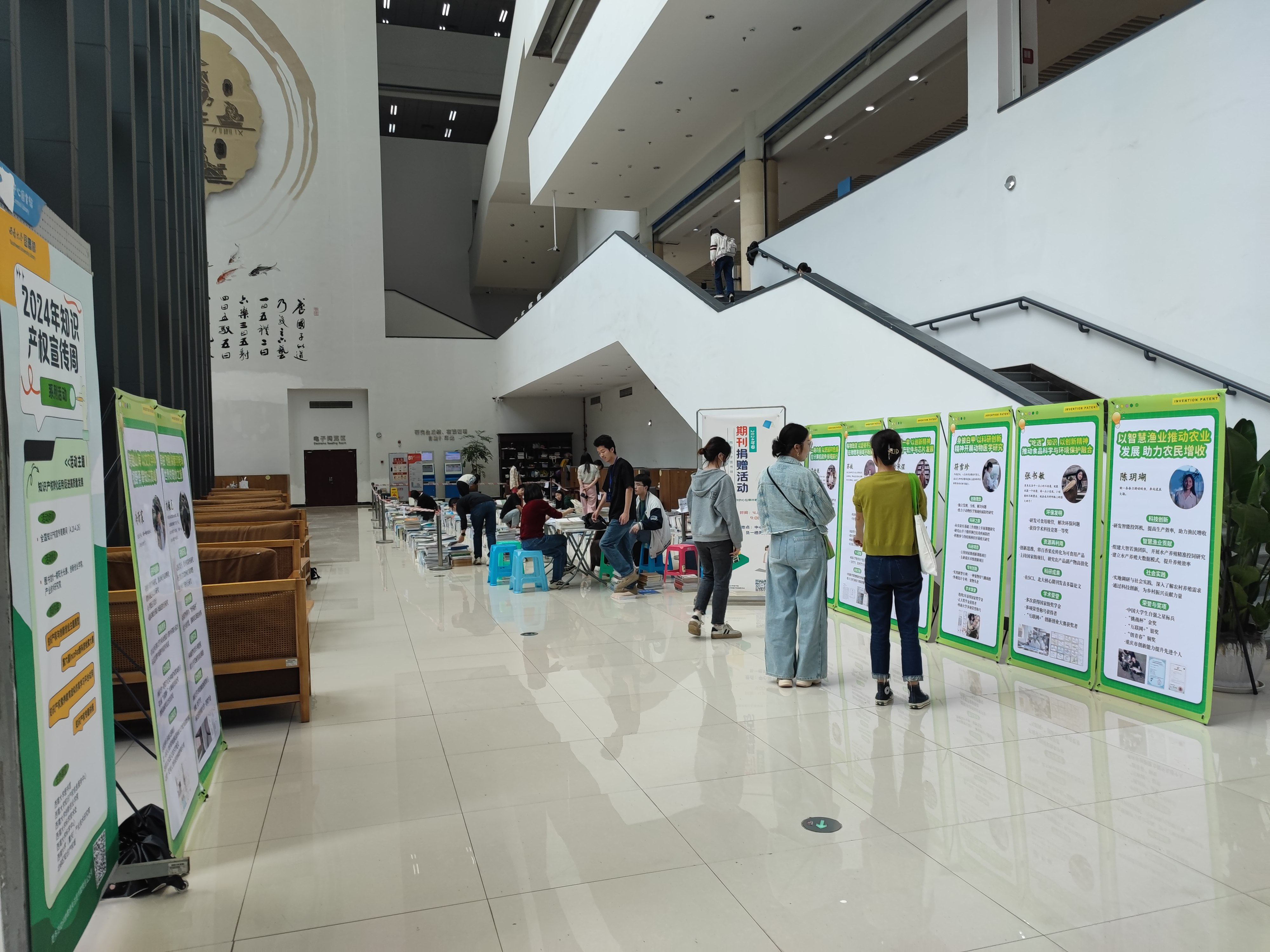 4月20日至30日,图书馆、创新创业学院、资产经营有限公司、科学技术处(科协)等在中心图书馆联合举办“知识产权与创新创业”主题展览,宣传学校科研团队成果转化的典型案例和学生创新创业的优秀案例。展出海报反映了学校科研团队成果转化显著成效,以及学生在创新项目、发明专利、科研竞赛、社会实践等方面的成就与荣誉,充分体现金年会jinnianhuicom师生在知识产权创新和利用方面的能力。学生纷纷驻足观看并在主题展架前进行拍照打卡。