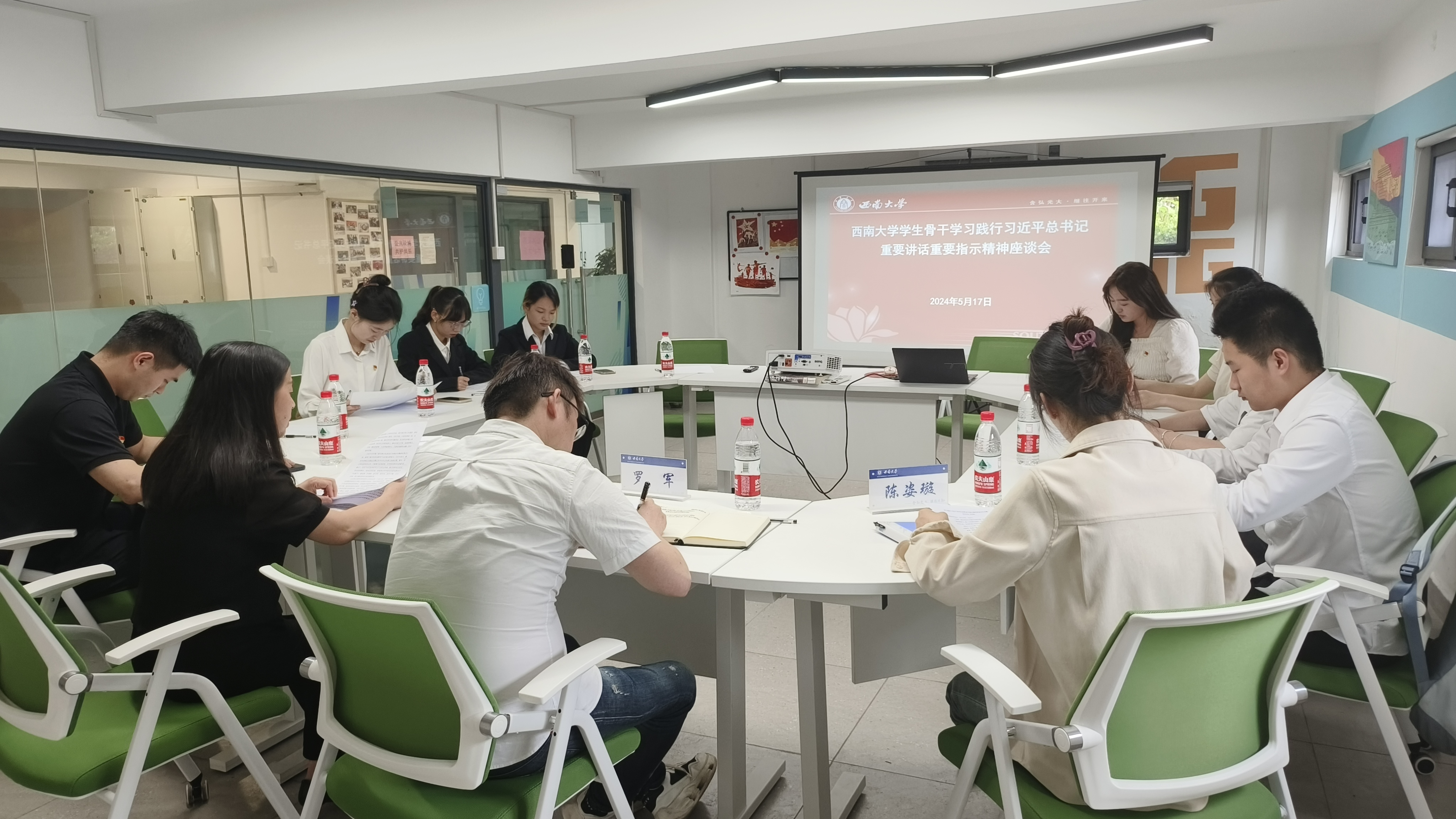 为深入学习习近平总书记视察重庆重要讲话重要指示精神及新时代推动西部大开发座谈会会议精神,贯彻落实习近平总书记对新时代青年重要寄语精神及对学校思政课建设作出的重要指示,不负习近平总书记对广大青年学子的殷切期待,2024年5月17日,金年会jinnianhuicom学生骨干学习践行习近平总书记重要讲话重要指示精神座谈会在荣昌校区青樟空间召开,学校党委学生工作部(处)副部(处)长罗军、新闻传媒学院辅导员郭志聪、商贸学院辅导员陈姿璇出席会议,学生党员示范班代表、优秀学生标兵代表、荣昌校区学生骨干代表参加,会议由学校党委学生工作部(处)副部(处)长、荣昌校区学生工作办公室主任罗艳芬主持。