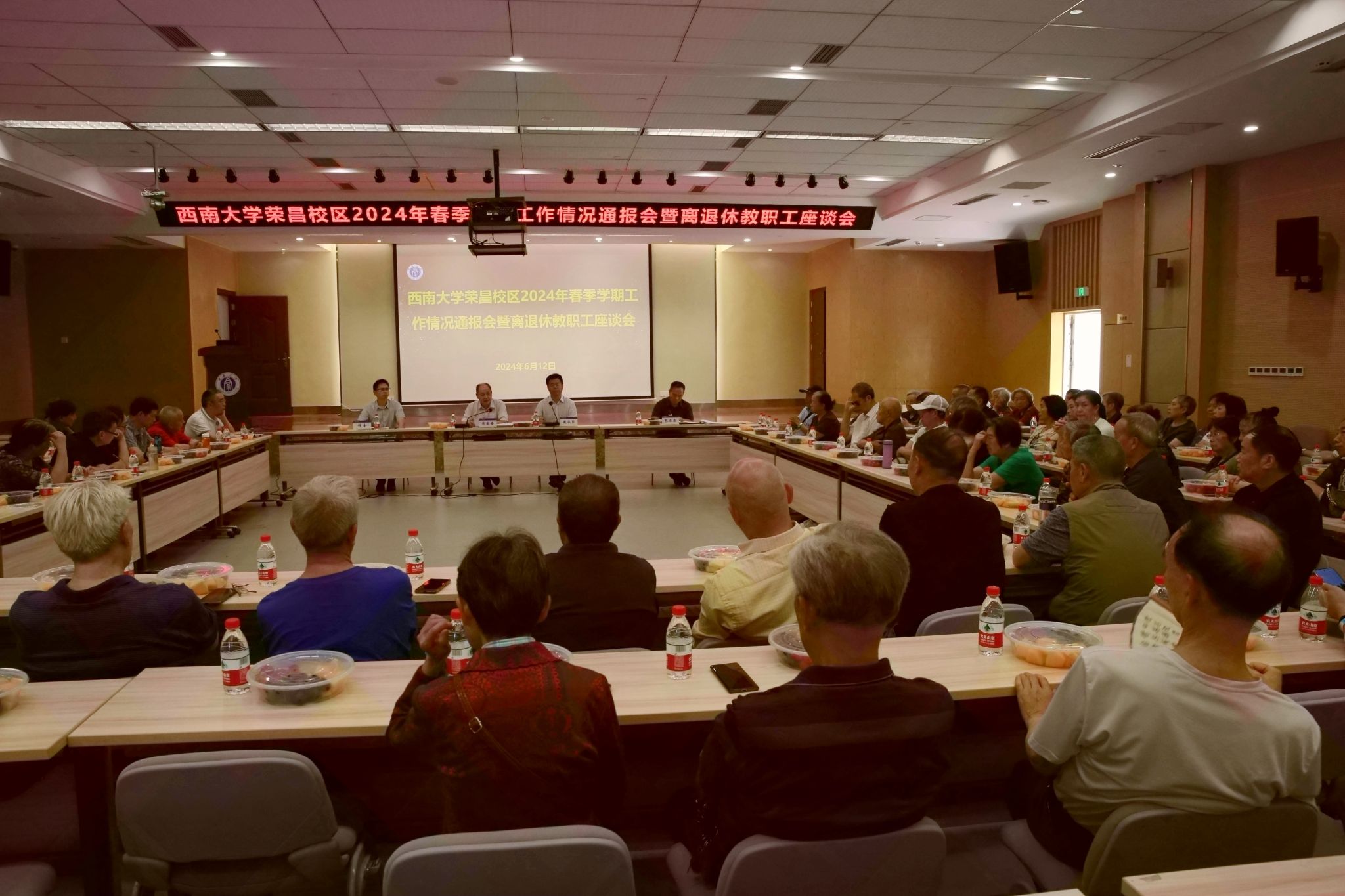 6月12日,金年会jinnianhuicom荣昌校区2024年春季学期工作情况通报会暨离退休教职工座谈会在7B101报告厅举行,校区管委会主任赵永聚主持会议,校区党工委书记周国安通报工作情况。校区党工委副书记、纪工委书记穆奎,副处级组织员包尔泉出席会议,离退休工作办公室全体工作人员及70余名离退休教职工参加会议。