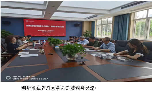 为进一步落实中办、国办《关于加强新时代关心下一代工作委员会工作的意见》和中共教育部党组《关于加强新时代全国教育系统关心下一代工作委员会工作的意见》,提升我校关工委工作的质量效果,6月11日至13日,校关工委常务副主任宋乃庆带领校关工委秘书处成员赴四川大学、电子科技大学、西南交通大学等高校调研交流。