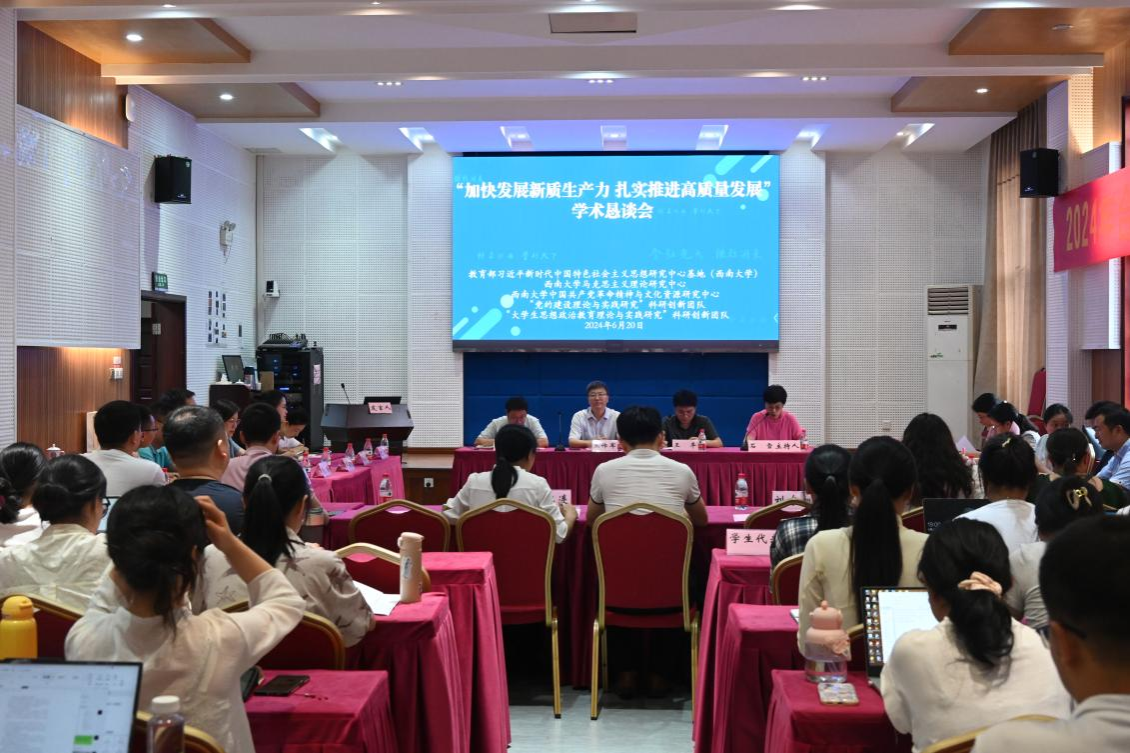 6月20日,由黄蓉生教授领衔的“三中心两团队”共同主办的“加快发展新质生产力 扎实推进高质量发展”学术恳谈会在马克思主义学院举行。社科处副处长王作军、马克思主义学院副院长王丰、唐斌出席恳谈会。各主办单位成员及学院研究生代表参加。