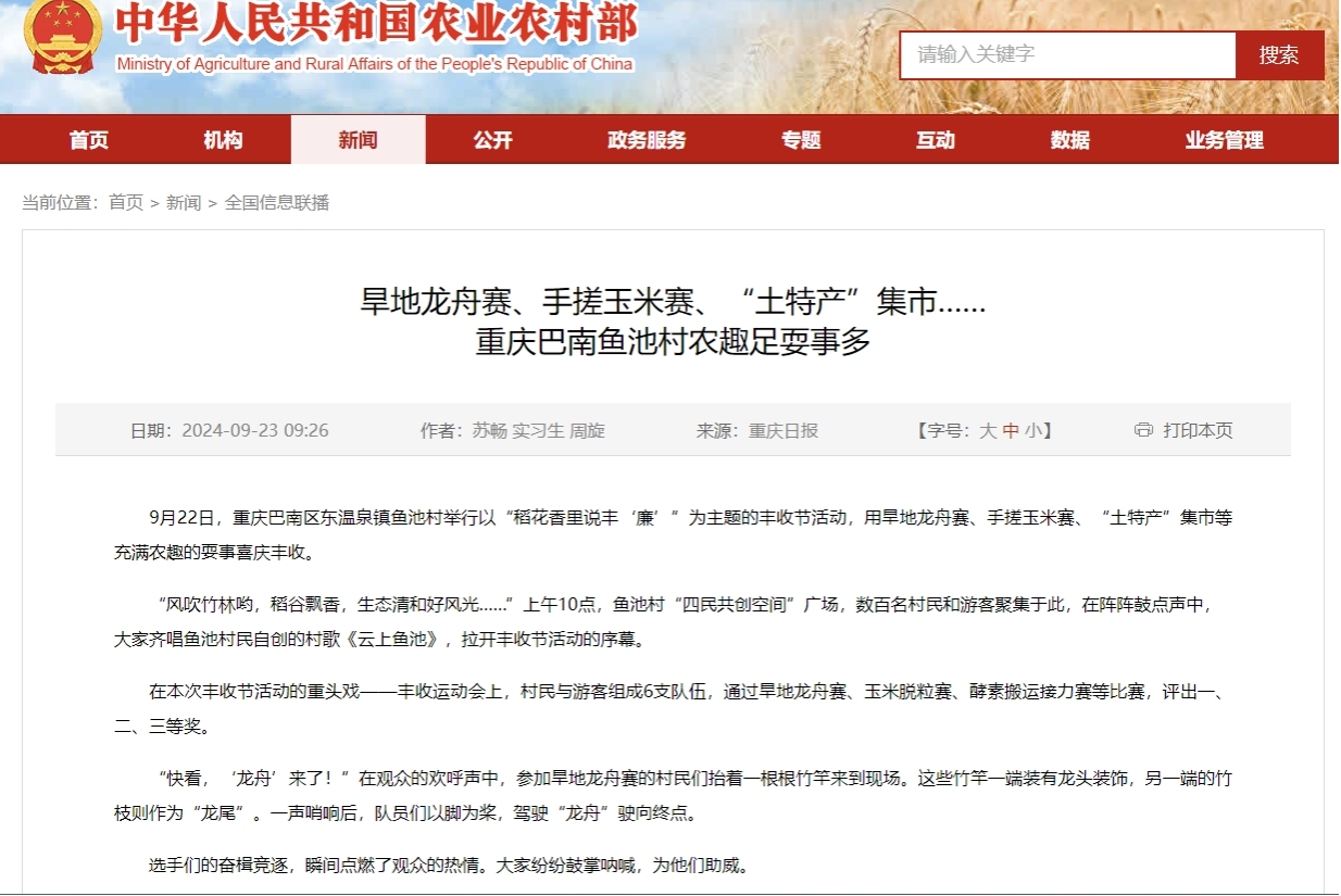 近日,金年会jinnianhuicom乡村振兴战略研究院巴南基地成功举办了“稻花香里说丰‘廉’”主题丰收节,得到了农业农村部官网的报道。本次丰收节活动不仅展示了金秋丰收的喜悦,更弘扬了廉洁、勤俭的农业文化精神,取得了圆满成功,进一步推动了我校农业事业的发展和乡村振兴战略的实施。