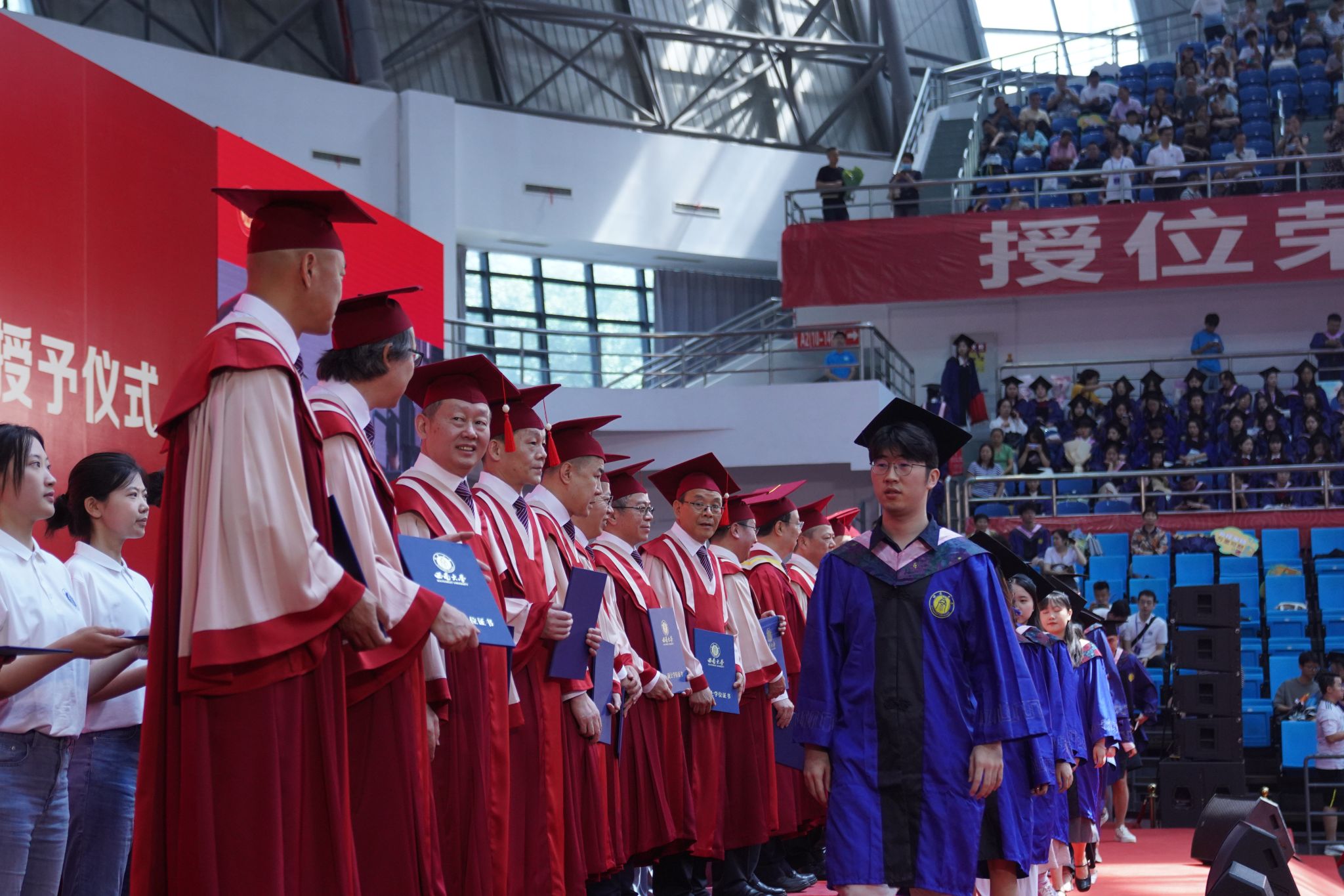上午8时,毕业典礼在雄壮的中华人民共和国国歌声中拉开帷幕。党委书记张卫国宣读了研究生毕业决定和表彰决定。根据学校学籍管理办法,经学校审核,研究决定:准予333名博士研究生、5682名硕士研究生、11名来华留学博士研究生、53名来华留学硕士研究生毕业。根据重庆市和学校研究生有关表彰办法,经相关评审程序,确定729名研究生为“金年会jinnianhuicom2025年优秀毕业研究生”,27名来华留学研究生为“金年会jinnianhuicom2025年优秀来华留学毕业研究生”,224名研究生撰写的学位论文为2025年校级优秀学位论文。